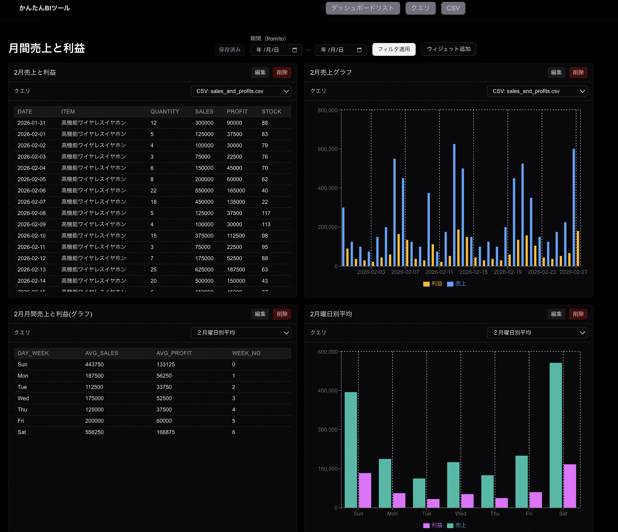 簡易認証、CSVアップロード、SQL編集、グラフ設定(json)、表示までを最小構成で実装しました。